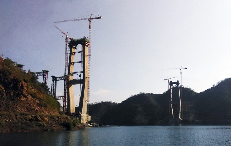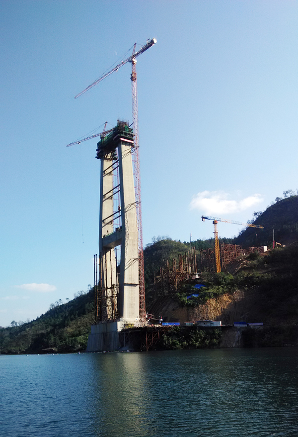 紅水河特大橋兩側(cè)橋墩高度均為210米,每個(gè)橋墩的起重機(jī)械配置均為川建生產(chǎn)的一臺(tái)C7036塔機(jī)、一臺(tái)C7030塔機(jī)和兩臺(tái)SC200/200WPZ中速變頻施工梯,副墩的施工機(jī)械為一臺(tái)P125平頭式塔機(jī)。 承擔(dān)主施工吊裝作業(yè)的C7036塔機(jī),最大起重量16噸,工作幅度為70米,C7030塔機(jī)最大起重量16噸,起升高度為220米,工作幅度為50米,兩臺(tái)塔機(jī)交叉式布置,覆蓋面大,C7036塔身斷面2.5米,主弦為圓鋼,C7030塔身斷面2米,主弦為角鋼,機(jī)構(gòu)配置均采用變頻無級(jí)調(diào)速系統(tǒng),啟動(dòng)、制動(dòng)平穩(wěn)。