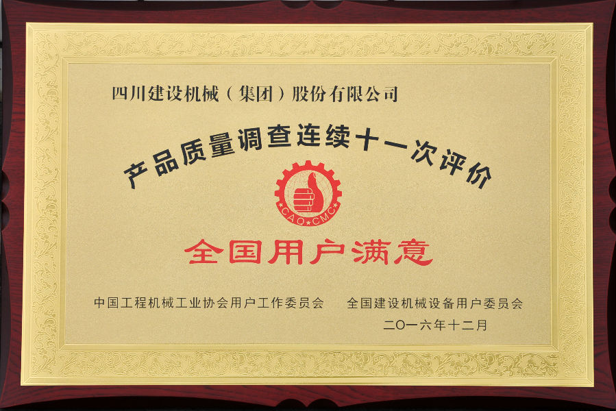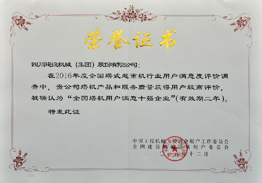 2016年全國用戶滿意產(chǎn)品評價測評結(jié)果公布,四川建設(shè)機(jī)械(集團(tuán))股份有限公司憑借良好的產(chǎn)品和服務(wù)質(zhì)量獲得全國用戶的較高評價,榮獲了“全國塔機(jī)用戶滿意十強(qiáng)”企業(yè);獲得產(chǎn)品質(zhì)量調(diào)查連續(xù)十一次評價“全國用戶滿意”企業(yè);公司生產(chǎn)的C7022、C7050、C7030、P7527塔式起重機(jī)以及SC200/200W施工升降機(jī)被評為“全國用戶滿意產(chǎn)品”;同時獲得“用戶滿意服務(wù)”獎;1989年至今川建已連續(xù)十一次獲得全國用戶滿意獎,得到了業(yè)內(nèi)用戶的高度認(rèn)可。