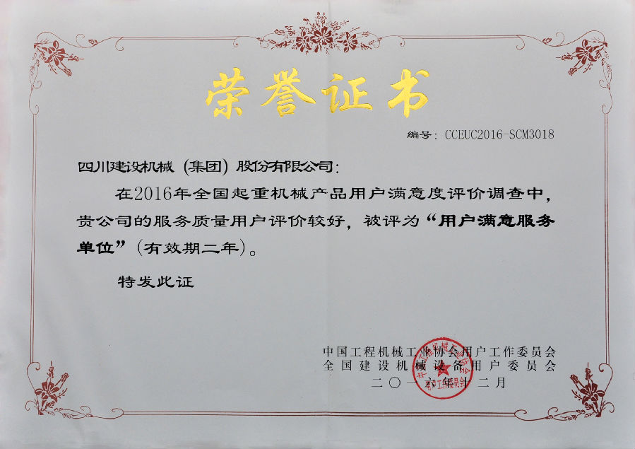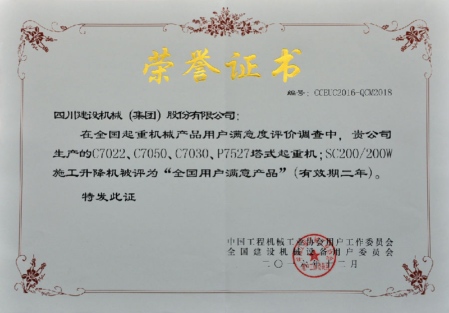 2016年全國用戶滿意產(chǎn)品評價測評結(jié)果公布,四川建設(shè)機(jī)械(集團(tuán))股份有限公司憑借良好的產(chǎn)品和服務(wù)質(zhì)量獲得全國用戶的較高評價,榮獲了“全國塔機(jī)用戶滿意十強(qiáng)”企業(yè);獲得產(chǎn)品質(zhì)量調(diào)查連續(xù)十一次評價“全國用戶滿意”企業(yè);公司生產(chǎn)的C7022、C7050、C7030、P7527塔式起重機(jī)以及SC200/200W施工升降機(jī)被評為“全國用戶滿意產(chǎn)品”;同時獲得“用戶滿意服務(wù)”獎;1989年至今川建已連續(xù)十一次獲得全國用戶滿意獎,得到了業(yè)內(nèi)用戶的高度認(rèn)可。