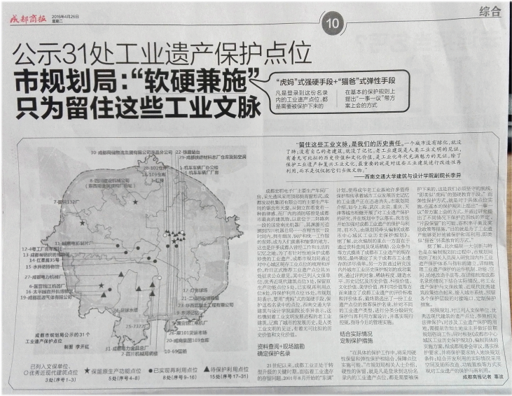 據(jù)成都商報(bào)2016年4月26日第十版訊,為了有針對(duì)性地保護(hù)成都珍貴的工業(yè)遺產(chǎn),成都市規(guī)劃局通過對(duì)中心城區(qū)現(xiàn)存工業(yè)點(diǎn)位的梳理和評(píng)價(jià),規(guī)劃推薦工業(yè)遺產(chǎn)點(diǎn)位共31處,其中已列入文保單位、優(yōu)秀近現(xiàn)代建筑點(diǎn)位3處,保留原生產(chǎn)功能點(diǎn)位5處,已實(shí)現(xiàn)再利用點(diǎn)位8處,帶保護(hù)利用點(diǎn)位15處。