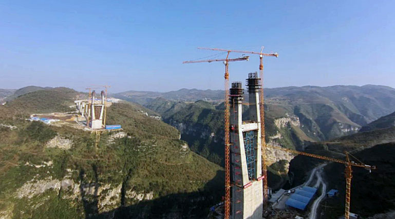 六廣河特大橋是整條高速公路最為重要,同時(shí)也是施工難度最大的控制性工程,兩側(cè)橋墩高度均為242米,每個(gè)橋墩的起重機(jī)械配置均為川建生產(chǎn)的兩臺(tái)C7030塔機(jī)和兩臺(tái)SC200/200WPZ中速變頻施工梯。