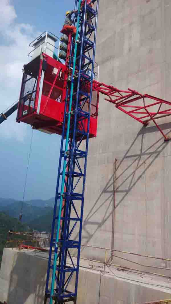 用于載人和提升物件的兩臺(tái)施工升降機(jī)配置高度均為248米,3×15kW三電機(jī)驅(qū)動(dòng),額定提升速度0~55 m/min,電纜形式采用滑觸式,解決了超高施工升降機(jī)的電纜自重負(fù)荷問題。