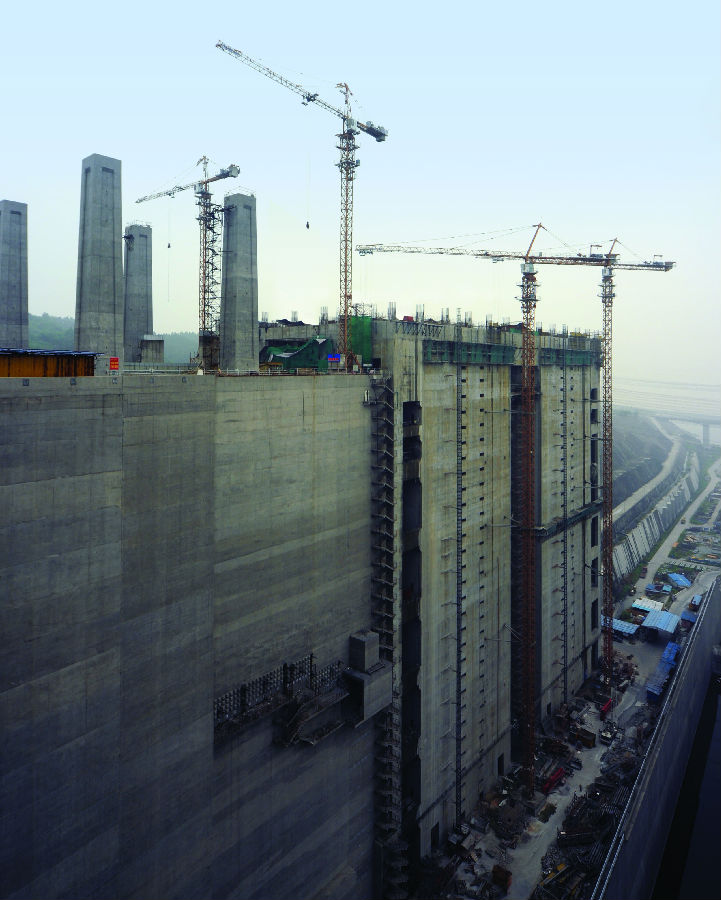 在此次升船機建設(shè)施工中,使用了川建2臺C7030和2臺F0/23B塔機,用于升船機壩體澆筑,鋼筋、模板吊裝等作業(yè)。另有4臺川建SC系列施工升降機用于施工人員的運送及施工物品的裝載。其中C7030塔機最大起重力矩274噸米,最大起重量16t,端部吊重3t,工作幅度70米,2臺塔機均固定附著式,附著在升船機壩體,附著高度達到185米。F0/23B塔機為標準高度的行走式,最大起重力矩132噸米,最大起重量10t,端部吊重2.3t,工作幅度50米。而4臺施工升降機均為SC200/200W,使用了德國先進的SEW施工升降機專用電機減速器,其單籠功率為3×11kW,并采用變頻控制,PLC邏輯處理,通過采集操作運行中的各種信號進行綜合邏輯分析,使升降機的運行更為平穩(wěn)、安全可靠。吊籠尺寸為3×1.5×2.7米,、便于體積較大物料運輸。川建升降機均對吊籠、標準節(jié)、附墻等結(jié)構(gòu)進行了大量的優(yōu)化設(shè)計,使得結(jié)構(gòu)更加合理、整機更加安全可靠。