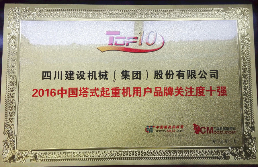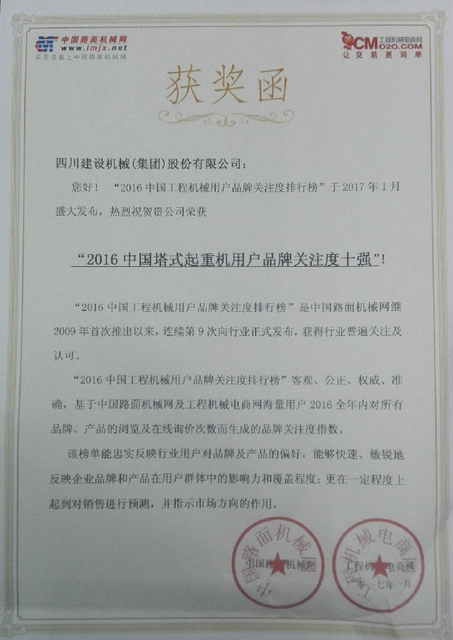 2017年1月3日,中國路面機械網(wǎng)和工程機械電商網(wǎng)在北京發(fā)布“2016中國塔式起重機用戶關(guān)注度排行榜”,四川建設機械(集團)股份有限公司進入“2016中國塔式起重機用戶品牌關(guān)注度排行榜”前十強,排名第二位。